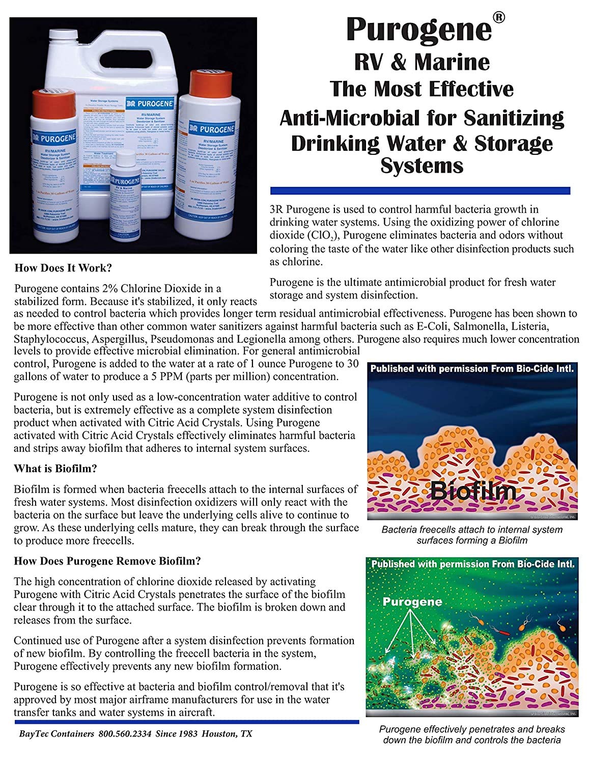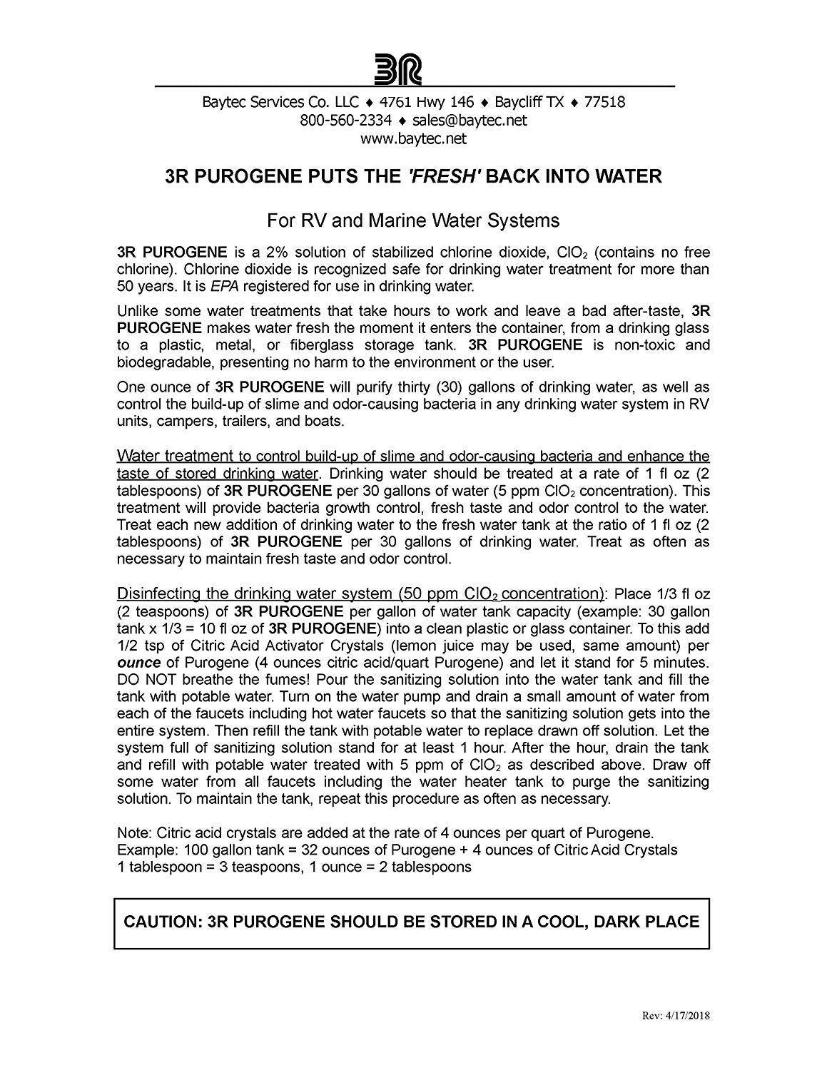 - Unlike some water treatments that take hours to work and leave a bad after-taste, 3R PUROGENE makes water fresh the moment it enters the container, from a drinking glass to a plastic, metal, or fiberglass storage tank. 3R